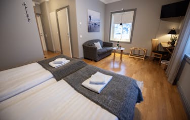Hotellet ligger bara några meter från receptionen och erbjuder boende i åtta dubbelrum med utsikt över vår omgivande natur. Två av dessa rum är trebäddsrum samt tillgänglighetsanpassade. I samtliga hotellrum kan extrasäng ställas in om så önskas.